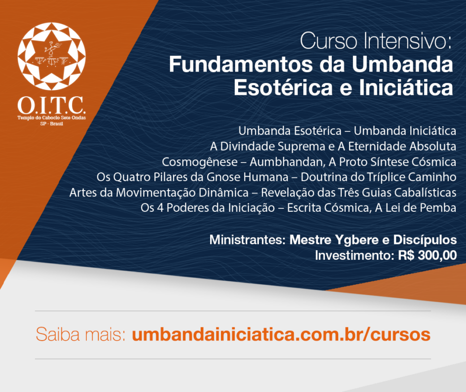 A Ordem Iniciática do Tríplice Caminho (OITC) – Templo do Sr. das 7 Ondas, por meio de seu dirigente, o Mestre-Raiz Ygbere, tem a alegria de anunciar o curso intensivo online: Fundamentos da Umbanda Esotérica e Iniciática.